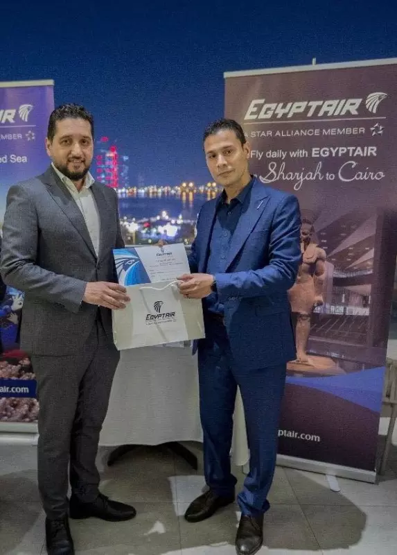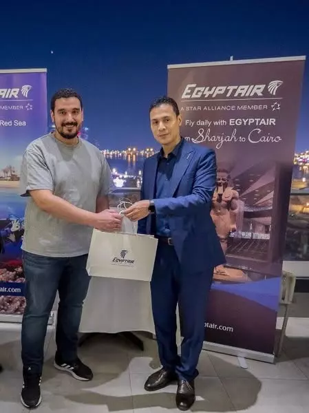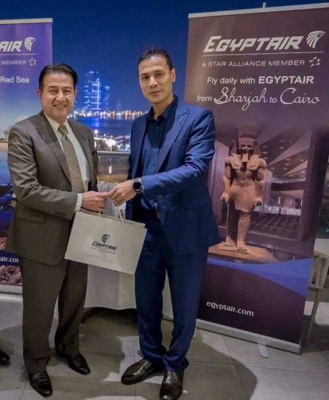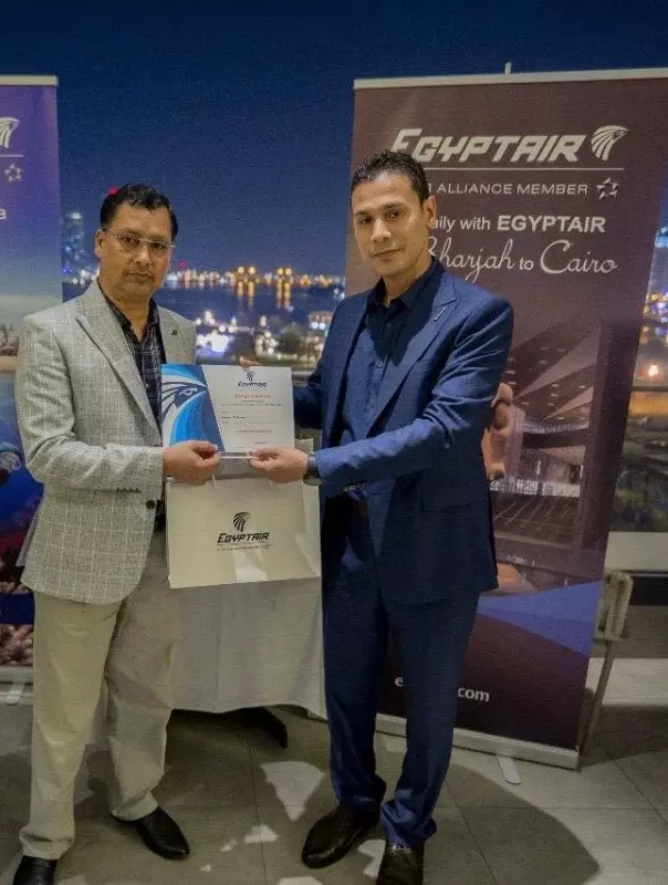 أقام مكتب مصر للطيران بالشارقة بدولة الإمارات العربية إحتفالية حضرها عدد من وكلاء السياحة والسفر وبعض من شركات السياحة (الأعلى مبيعات) و خالد الكيلاني مدير إدارة النقل الجوي وخدمات الطيران المدني بحكومة مطار الشارقة.