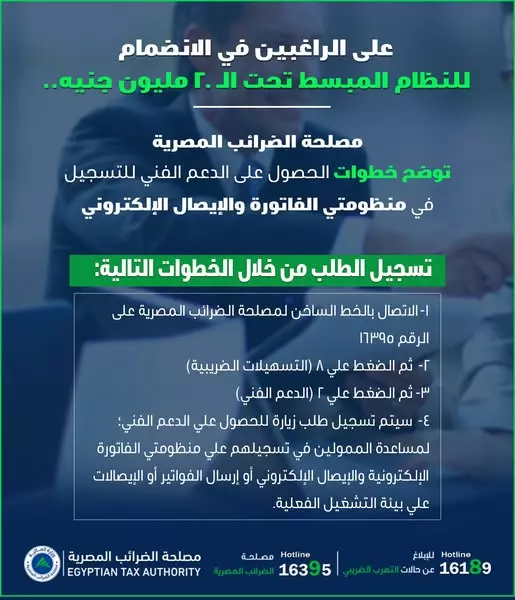الضرائب المصرية توضح خطوات طلب الدعم الفني للتسجيل في منظومتي الفاتورة والإيصال الإلكتروني للنظام المبسط تحت الـ 20 مليون جنيه