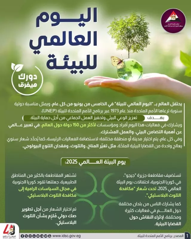 يحتفل العالم في 5 يونيو بـ”اليوم العالمي للبيئة”، وفي هذا العام، تستضيف جزيرة “جيجو” الكورية الفعاليات تحت شعار “مكافحة التلوث البلاستيكي”، تأكيدًا على خطورة هذا التحدي العالمي الذي يشهد إنتاج 430 مليون طن من البلاستيك سنويًّا، يُهدر معظمه في صورة نفايات تُلوِّث البحار والأنهار.