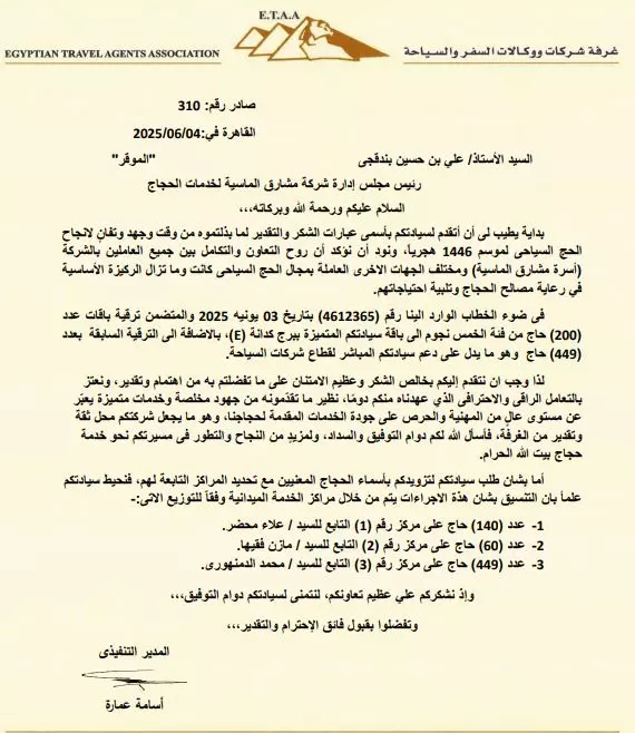 ووجهت الغرفة خطابها إلى علي بن حسين بنقشي، رئيس مجلس إدارة شركة مطوف الماسية، متضمنًا أسماء الحجاج المصريين الموزعين على مراكز الخدمة الخاصة بالشركة، وهم: