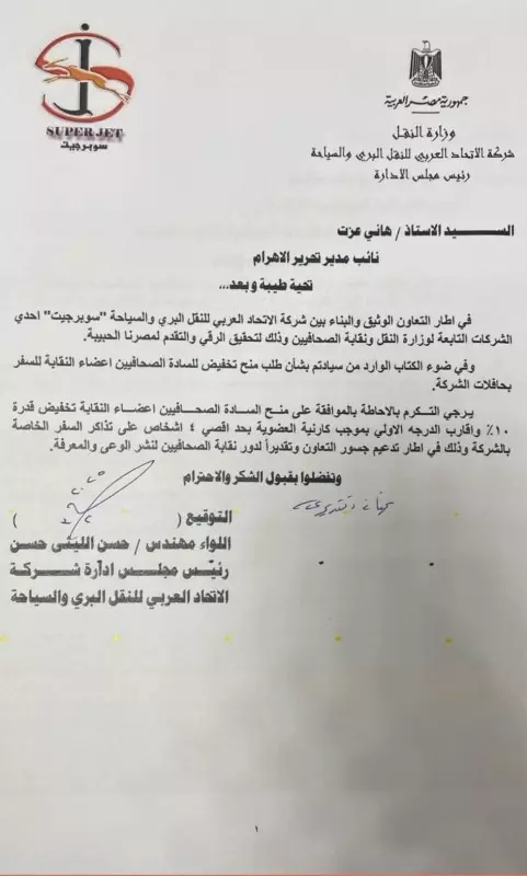 أعلن الزميل الكاتب الصحفى هانى عزت ، نائب مدير تحرير جريدة الأهرام ، حصوله على موافقة رسمية من اللواء المهندس حسن الليثى حسن ، رئيس مجلس إدارة شركة الاتحاد العربي للنقل البري والسياحة “سوبر جيت” -إحدى الشركات التابعة لوزارة النقل – بمنح الصحفيين أعضاء الجمعية العمومية نسبة تخفيض قدرها 10 % على قيمة تذكرة السفر على جميع الرحلات داخل جمهورية مصر العربية بموجب تقديم كارنيه النقابة