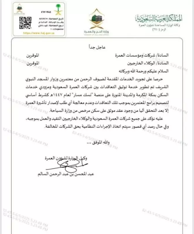 وأشارت الوزارة إلى أن الاستعدادات التقنية والتشغيلية للموسم الجديد بدأت مبكرًا، بالشراكة مع الجهات ذات العلاقة، لضمان انسيابية الإجراءات واستدامة التحسين، وتستمر الجهود لتوسيع نطاق الخدمات الرقمية والتوعوية بعدة لغات، وتحقيق أعلى درجات السلامة والراحة للمعتمرين، بما يعكس الصورة المشرّفة للمملكة في خدمة قاصدي الحرمين الشريفين.