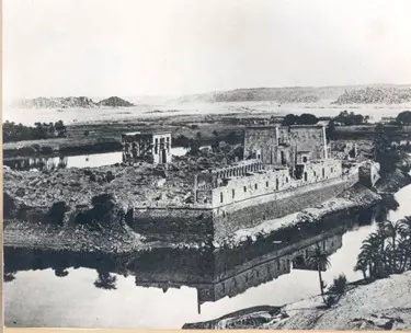 يعرض صورة أرشيفية لمعبد فيلة قبل وبعد الإنقاذ.