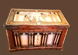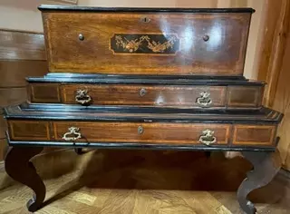 يعرض بيانو من الخشب المطعم بالنحاس وله حليات وتطعيم من حجارة اللازورد ورخامة البيانو من أهم مقتنيات قاعة الاوبيسون سرايا العرش.