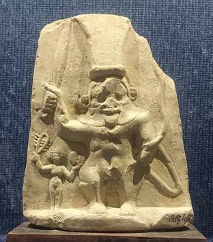 يعرض لوحة من الحجر الجيري عليها المعبود بس معبود المرح والموسيقى يمسك بيده اليمنى السيف في وضع راقص وبجواره سيدة تمسك بيدها اليمنى الشخشيخة وبيدها اليسرى الدف.