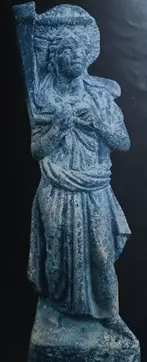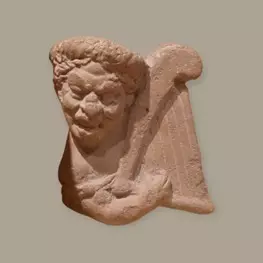 يعرض تمثال من الفخار يمثل النصف العلوي لشخص بجانبه إله موسيقية وترية يضع أصابعه عليها من العصر اليوناني الروماني.