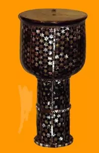 يعرض طبلة ذات رق من الخشب المطعم بالخشب والأبنوس والسن.