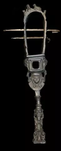 يعرض (شخشيخة) للمعبودة حتحور من البرونز، وتمثل وجه المعبوده حتحور بهيئة سيده ترتدي باروكه شعر وقلاده عريضه وعلى جانبي الرأس حيه الكوبرا تحمل فوق رأسها الكورنيش المصري.