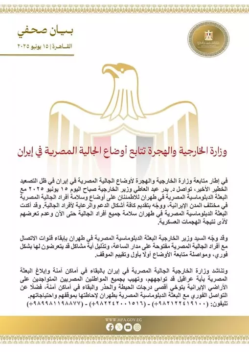 في إطار متابعة وزارة الخارجية والهجرة لأوضاع الجالية المصرية في إيران في ظل التصعيد الخطير الأخير، تواصل د. بدر عبد العاطي وزير الخارجية صباح اليوم 15 يونيو 2025  مع البعثة الدبلوماسية المصرية في طهران للاطمئنان على أوضاع وسلامة أفراد الجالية المصرية في مختلف المدن الإيرانية، ووجّه بتقديم كافة أشكال الدعم والرعاية لأفراد الجالية. وقد أكدت البعثة الدبلوماسية المصرية في طهران سلامة جميع أفراد الجالية حتى الآن وعدم تعرضهم لأذى نتيجة الهجمات العسكرية.