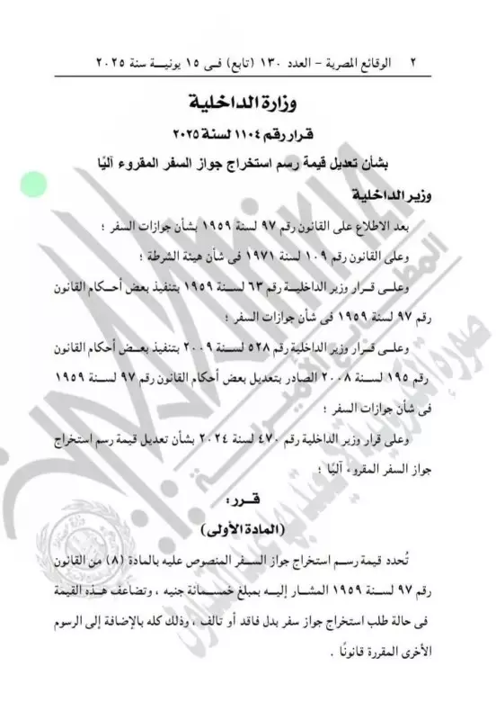 ونصت المادة الأولى على تحديد قيمة رسوم استخراج جواز السفر 2025 المنصوص عليه بالمادة 8 من القانون رقم 97 لسنة 1959 المشار إليه بمبلغ 500 جنيهًا، وتضاعف هذه القيمة في حالة طلب استخراج جواز سفر بدل فاقد أو تالف، وذلك كله بالإضافة إلى الرسوم الأخرى المقررة قانونا.