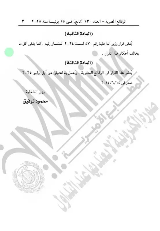 كما نصت المادة الثانية على أنه يلغى قرار وزير الداخلية رقم 470 لسنة 2024 المشار إليه، كما يلغى كل ما يخالف أحكام هذا القرار، كما نصت المادة الثالثة على ينشر هذا القرار في الوقائع المصرية، ويُعمل به اعتبارا من أول يوليو 2025.