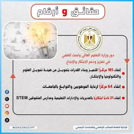 في إطار توجه الدولة نحو بناء مجتمع معرفي قائم على الابتكار والإبداع، تواصل وزارة التعليم العالي والبحث العلمي تنفيذ إستراتيجيتها لتعزيز البيئة الداعمة للابتكار داخل المؤسسات التعليمية، سواء في الجامعات أو المدارس، بما يسهم في اكتشاف ورعاية العقول المتميزة وتنمية قدراتها.