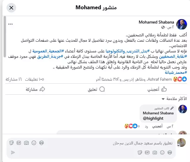 وفيما يخص ما أثير حول بدل الزملاء العاملين في جريدة الطريق، أوضح شبانة أن الأمر لا يعدو كونه موقفًا عارضًا جاري العمل على حله قانونيًا، مؤكدًا أن الجهود جارية لغلق هذا الملف بشكل نهائي بما يحفظ حقوق الزملاء.