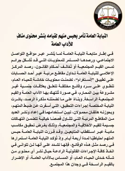 وإذ تُؤكد النيابة العامة استمرارها في رصد مثل هذه الوقائع، فإنها تشدد على أنها لن تتوانى في اتخاذ كافة الإجراءات القانونية الرادعة حيال نشر أي محتوى من شأنه خدش الحياء العام، أو المساس بالآداب العامة، أو الإضرار بالقيم الراسخة في وجدان هذا المجتمع.