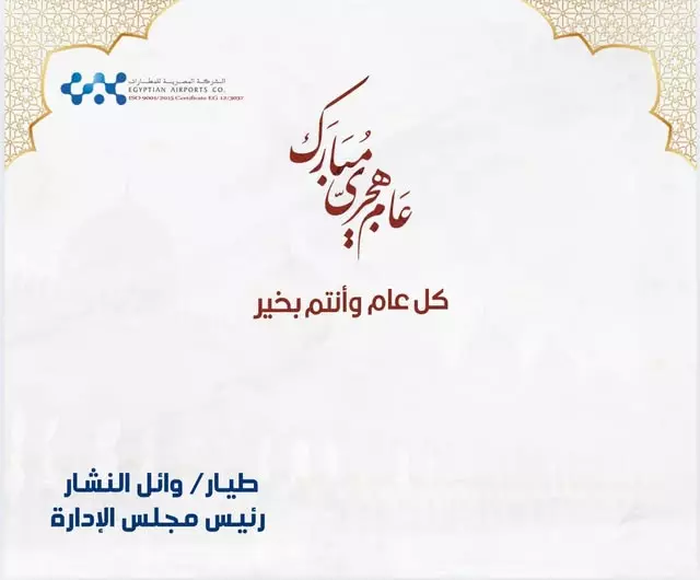 يتقدم اللواء طيار وائل النشار ، رئيس مجلس الإدارة والعضو المنتدب للشركة المصرية للمطارات ، بأصدق التهاني وأطيب الأمنيات إلى جميع العاملين في المطارات المصرية على امتداد الجمهورية، بمناسبة حلول العام الهجري الجديد 1447 هـ ، مُعربًا عن تقديره العميق لجهودكم المخلصة وتفانيكم في أداء واجباتكم التي تُسهم في رفع كفاءة منظومة الطيران المدني المصري، وتعكس الوجه الحضاري لمطاراتنا أمام العالم.