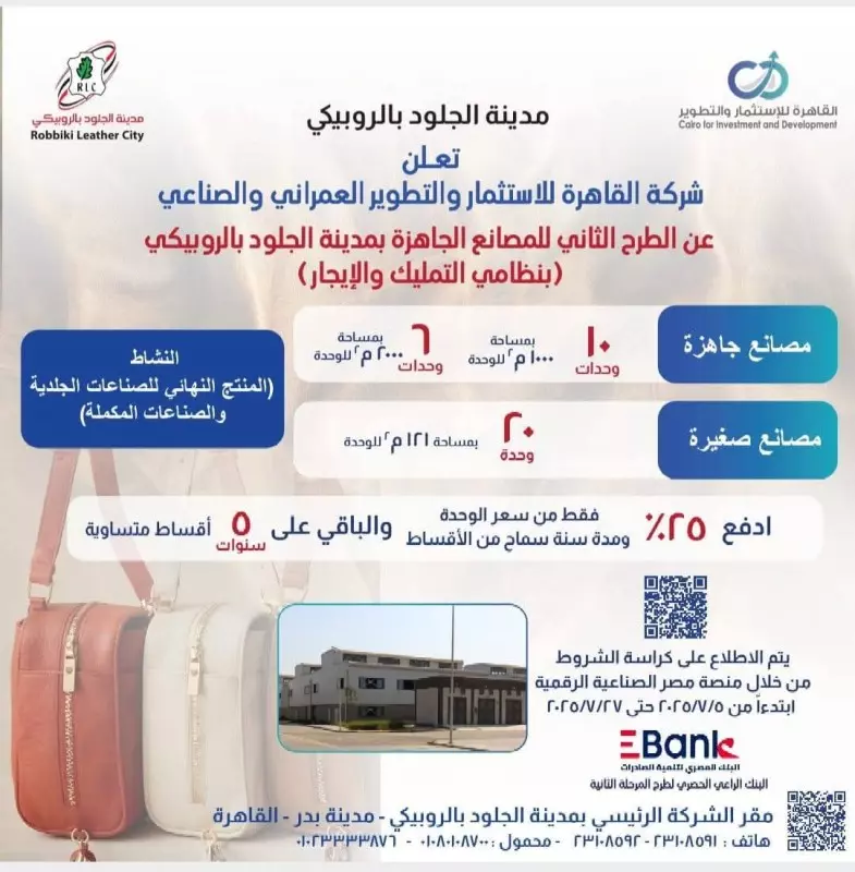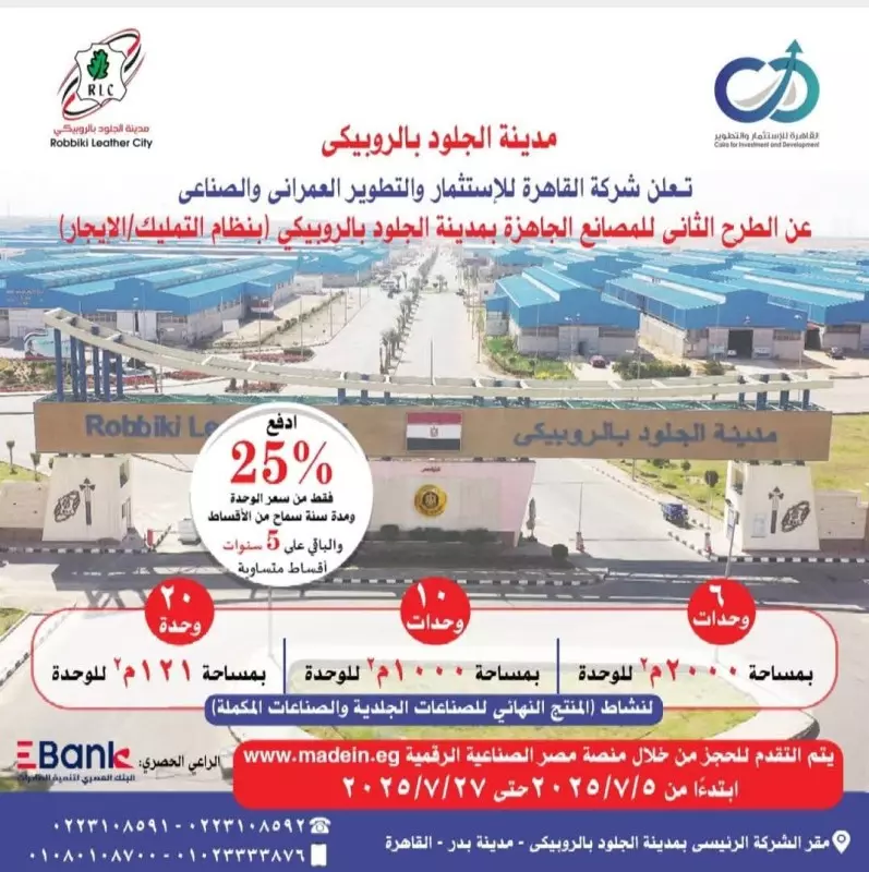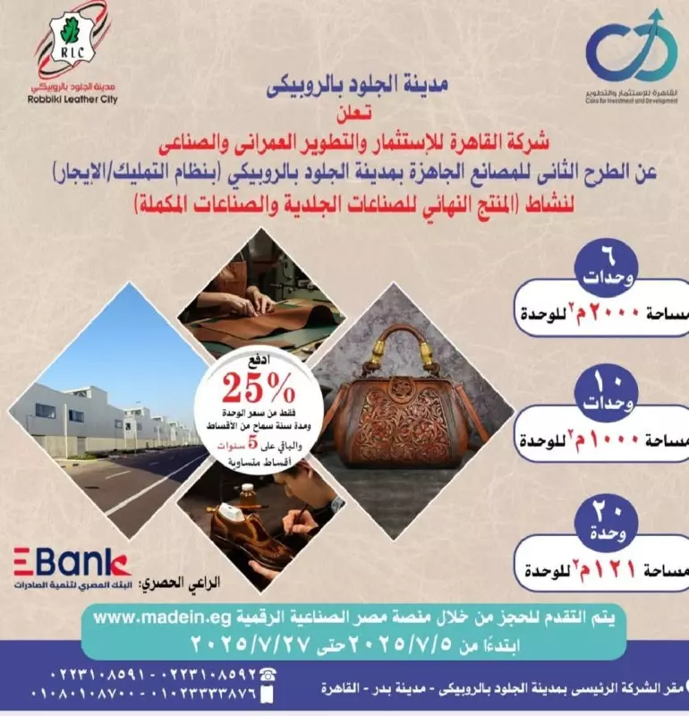 مضيفا انه في إطار حرص وزارة الصناعة على دعم المستثمر الجاد وتحفيز بيئة إنتاجية مرنة ومستقرة داخل مدينة الجلود بالروبيكي، فإن الطرح الجديد تم بنظامي التمليك والإيجار، مع تيسيرات غير مسبوقة تشمل في حالة التمليك إتاحة نظام سداد مرن يبدأ بسداد مقدم بنسبة 25% فقط و تقسيط المبلغ المتبقي على فترة تصل إلى 6 سنوات بالاضافة الى سنة سماح كاملة قبل سداد أول قسط تمليك وفائدة سنوية مدعومة لا تتجاوز 10% ضمن مبادرة دعم الصناعة، ويتم السداد من خلال شركة القاهرة للاستثمار والتطوير لافتا الى انه في حالة الإيجاريقوم المستثمر بسداد قيمة 3 أشهر فقط كتأمين عند التقدم للحجز، وعند التخصيص، يتم سداد 3 أشهر أخرى كمقدم إيجار موضحا أن فترة السماح مدتها 3 أشهر قبل سداد أول دفعة إيجارية.