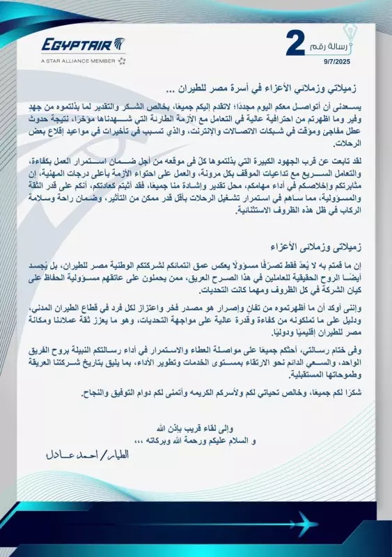 وأشار عادل في رسالته إلى أن فرق العمل أظهرت مرونة وسرعة كبيرة في احتواء الموقف، بما يضمن استمرار العمل بكفاءة وراحة الركاب، مؤكدًا أن هذا الأداء يعكس ما يتحلى به أبناء مصر للطيران من انضباط ومهارة ومسؤولية في أحلك الظروف