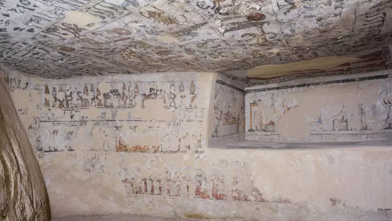 كما تغطي الجدران مناظر جنائزية وزخارف ملونة على الملاط، تمتد حتى جوانب كوة الدفن وسقفها وأرضيتها، في مشهد فني نادر لم يُشاهد مثله إلا في القليل من المواقع المصرية.
