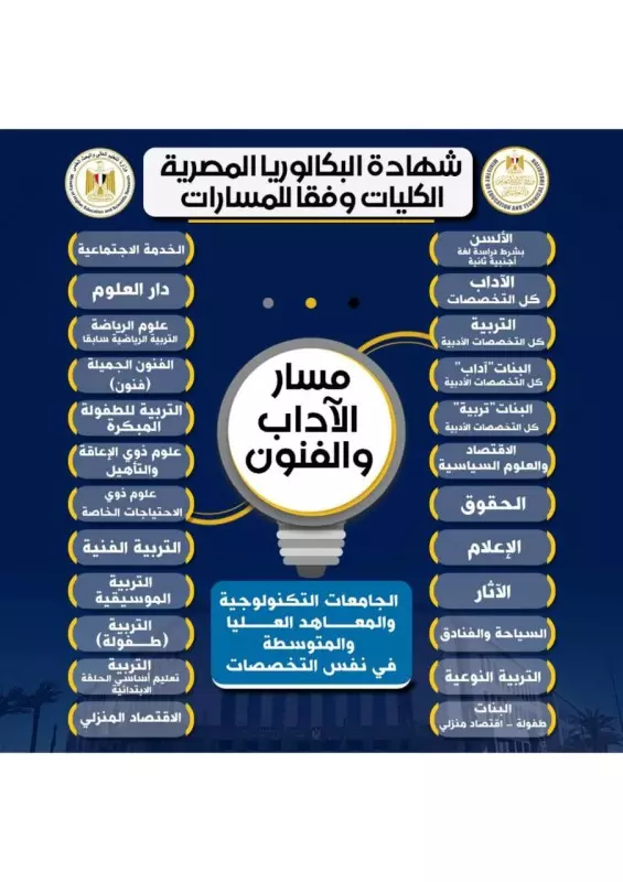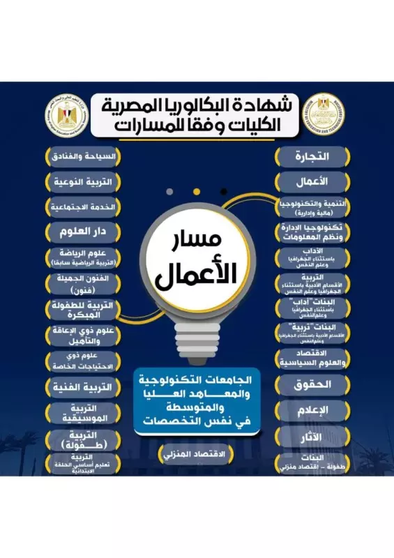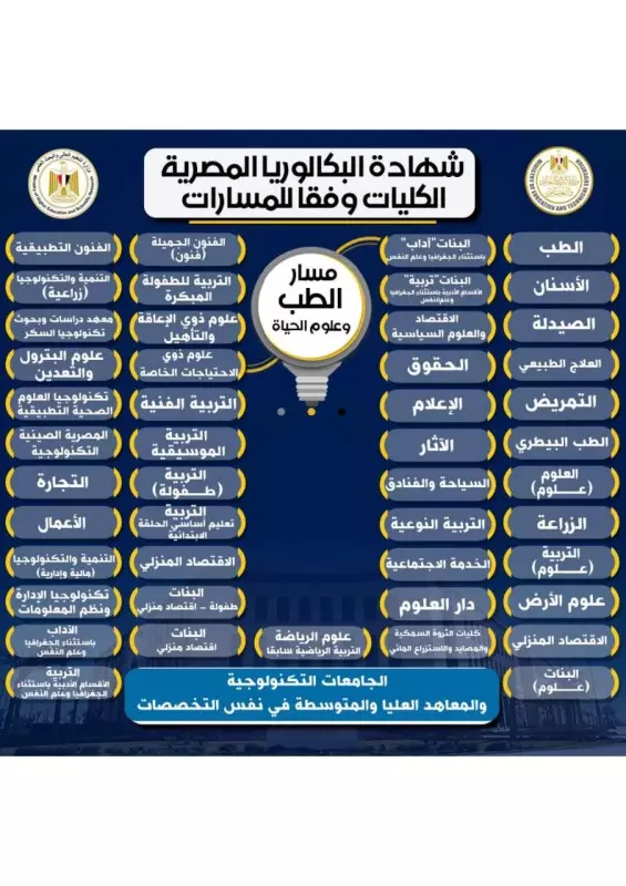 تم توضيح تفاصيل المسارات المختلفة في البكالوريا، وكذلك الشعب في الثانوية العامة، والكليات والتخصصات الجامعية لكل منها، في الصور المرفقة بهذا البيان. وقد تم مراعاة التكافؤ بين مسارات البكالوريا والشعبة المقابلة لها في الثانوية العامة لضمان عدالة الاختيار.