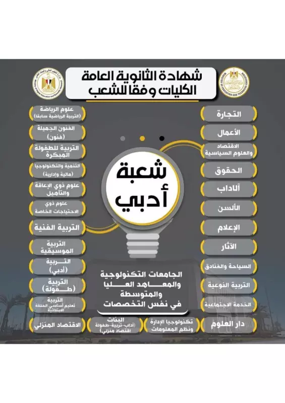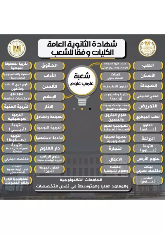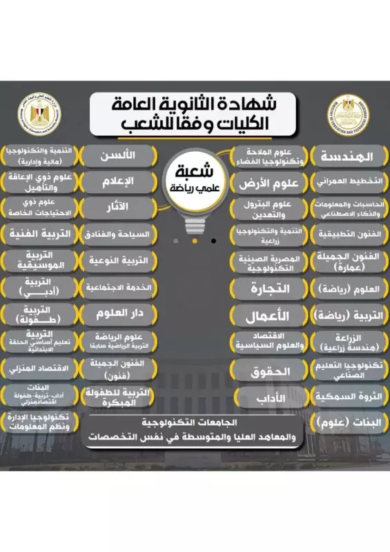 وكذلك تفاصيل الكليات والتخصصات الجامعية المتاحة للشعب المختلفة في الثانوية العامة.