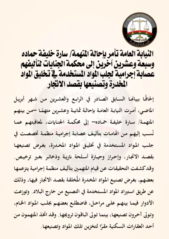 إلحاقًا ببيانها السابق الصادر في الرابع والعشرين من شهر أبريل الماضي، أمرت النيابة العامة بإحالة ثمانية وعشرين متهمًا –من بينهم المتهمة/ سارة خليفة حماده– إلى محكمة الجنايات، لمعاقبتهم عما نُسب إليهم من اتهامات بتأليف عصابة إجرامية منظمة تخصصت في جلب المواد المستخدمة في تخليق المواد المخدرة، بغرض تصنيعها بقصد الاتجار، وإحراز وحيازة أسلحة نارية وذخائر بغير ترخيص.