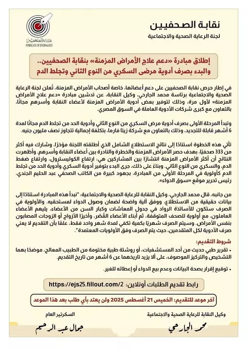 في إطار حرص نقابة الصحفيين على دعم أعضائها، خاصة أصحاب الأمراض المزمنة، تُعلن لجنة الرعاية الصحية والاجتماعية برئاسة محمد الجارحي، وكيل النقابة، عن تدشين مبادرة «دعم علاج الأمراض المزمنة» لأول مرة، وذلك لتوفير بعض أدوية الأمراض المزمنة لأعضاء النقابة وأسرهم مجانًا، بالتعاون مع كبرى شركات الأدوية العاملة في السوق المصري.