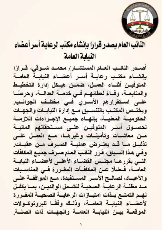 أصدر النائب العام المستشار محمد شوقي، قرارًا بإنشاء مكتب رعاية أسر أعضاء النيابة العامة المتوفين أثناء العمل، ضمن هيكل إدارة التخطيط والمتابعة، وفاءً لعطائهم في خدمة العدالة، وحرصًا على استقرارهم الأسري في مختلف الجوانب.
