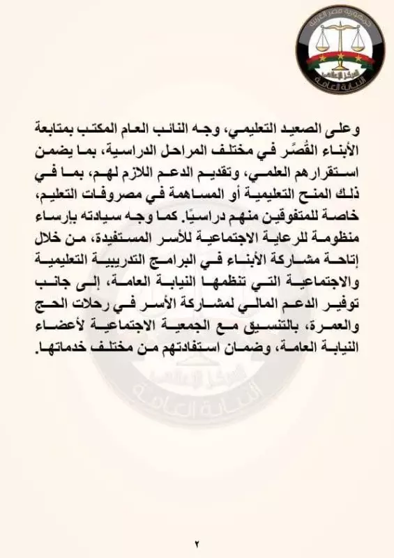 وعلى الصعيد التعليمي، وجه النائب العام المكتب بمتابعة الأبناء القُصَّر في مختلف المراحل الدراسية، بما يضمن استقرارهم العلمي، وتقديم الدعم اللازم لهم، بما في ذلك المنح التعليمية أو المساهمة في مصروفات التعليم، خاصة للمتفوقين منهم دراسيًا. كما وجه سيادته بإرساء منظومة للرعاية الاجتماعية للأسر المستفيدة، من خلال إتاحة مشاركة الأبناء في البرامج التدريبية التعليمية والاجتماعية التي تنظمها النيابة العامة، إلى جانب توفير الدعم المالي لمشاركة الأسر في رحلات الحج والعمرة، بالتنسيق مع الجمعية الاجتماعية لأعضاء النيابة العامة، وضمان استفادتهم من مختلف خدماتها.