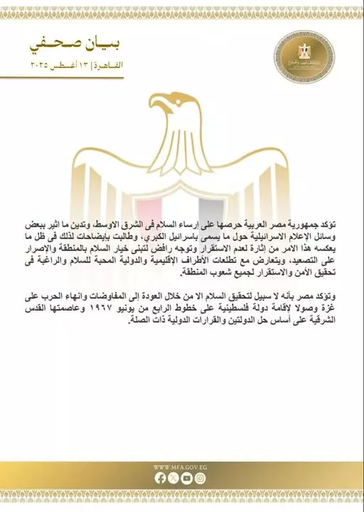تؤكد جمهورية مصر العربية حرصها على إرساء السلام فى الشرق الأوسط، وتدين ما أثير ببعض وسائل الإعلام الإسرائيلية حول ما يسمى بإسرائيل الكبري، وطالبت بإيضاحات لذلك فى ظل ما يعكسه هذا الامر من إثارة لعدم الاستقرار وتوجه رافض لتبنى خيار السلام بالمنطقة والإصرار على التصعيد، ويتعارض مع تطلعات الأطراف الإقليمية والدولية المحبة للسلام والراغبة فى تحقيق الأمن والاستقرار لجميع شعوب المنطقة.