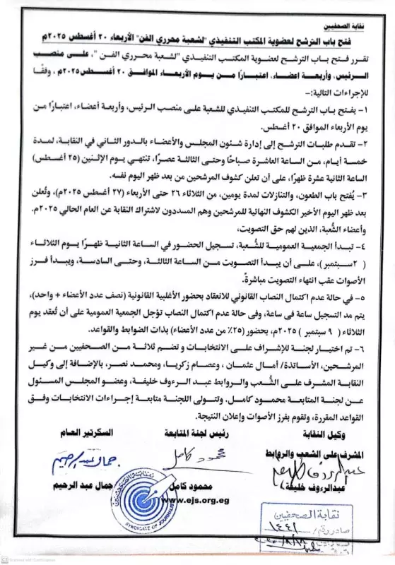 تقرر فتح باب الترشح لعضوية المكتب التنفيذي “لشعبة محرري الفن “، على منصب الرئيس، وأربعة اعضاء، اعتبارًا من يوم الأربعاء الموافق 20 أغسطس2025م ، وفقًا للإجراءات التالية:-