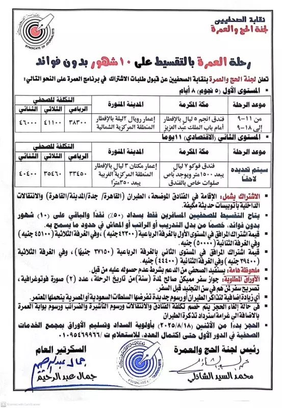 تعلن لجنة الحج والعمرة بنقابة الصحفيين عن قبول طلبات الاشتراك في برنامج العمرة على النحو التالي: