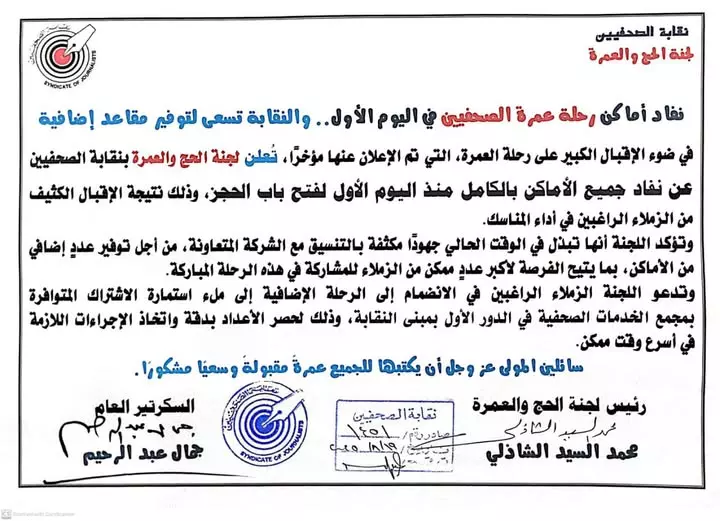 وتؤكد اللجنة أنها تبذل في الوقت الحالي جهودًا مكثفة بالتنسيق مع الشركة المتعاونة، من أجل توفير عدد إضافي من الأماكن، بما يتيح الفرصة لأكبر عدد ممكن من الزملاء للمشاركة في هذه الرحلة المباركة.