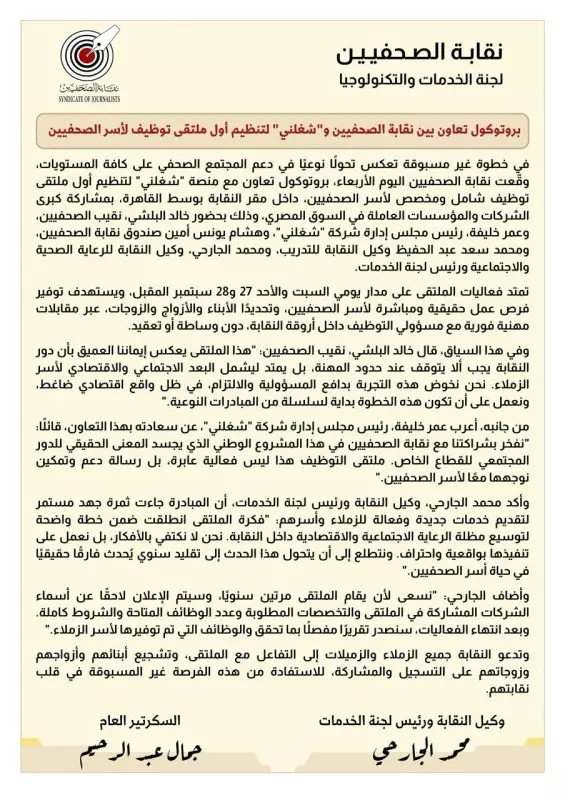 من جانبه، أعرب عمر خليفة، رئيس مجلس إدارة شركة “شغلني”، عن سعادته بهذا التعاون، قائلًا: “نفخر بشراكتنا مع نقابة الصحفيين في هذا المشروع الوطني الذي يجسد المعنى الحقيقي للدور المجتمعي للقطاع الخاص. ملتقى التوظيف هذا ليس فعالية عابرة، بل رسالة دعم وتمكين نوجهها معًا لأسر الصحفيين.”