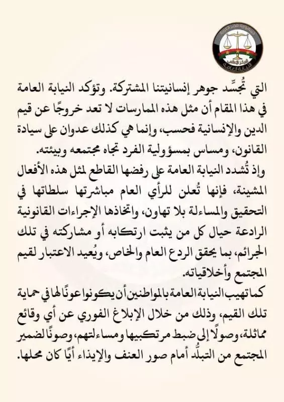 وإذ تُشدد النيابة العامة على رفضها القاطع لمثل هذه الأفعال المشينة، فإنها تُعلن للرأي العام مباشرتها سلطاتها في التحقيق والمساءلة بلا تهاون، واتخاذها الإجراءات القانونية الرادعة حيال كل من يثبت ارتكابه أو مشاركته في تلك الجرائم، بما يحقق الردع العام والخاص، ويُعيد الاعتبار لقيم المجتمع وأخلاقياته.