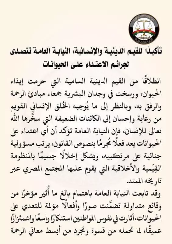 انطلاقًا من القيم الدينية السامية التي حرمت إيذاء الحيوان، ورسخت في وجدان البشرية جمعاء مبادئ الرحمة والرفق به، وبالنظر إلى ما يُوجبه الخُلق الإنساني القويم من رعاية وإحسان إلى الكائنات الضعيفة التي سخَّرها الله تعالى للإنسان، فإن النيابة العامة تؤكد أن أي اعتداء على الحيوانات يعد فعلًا مُجرمًا بنصوص القانون، يرتب مسؤولية جنائية على مرتكبيه، ويشكل إخلالًا جسيمًا بالمنظومة القِيَمية والأخلاقية التي يقوم عليها المجتمع المصري عبر تاريخه الممتد.