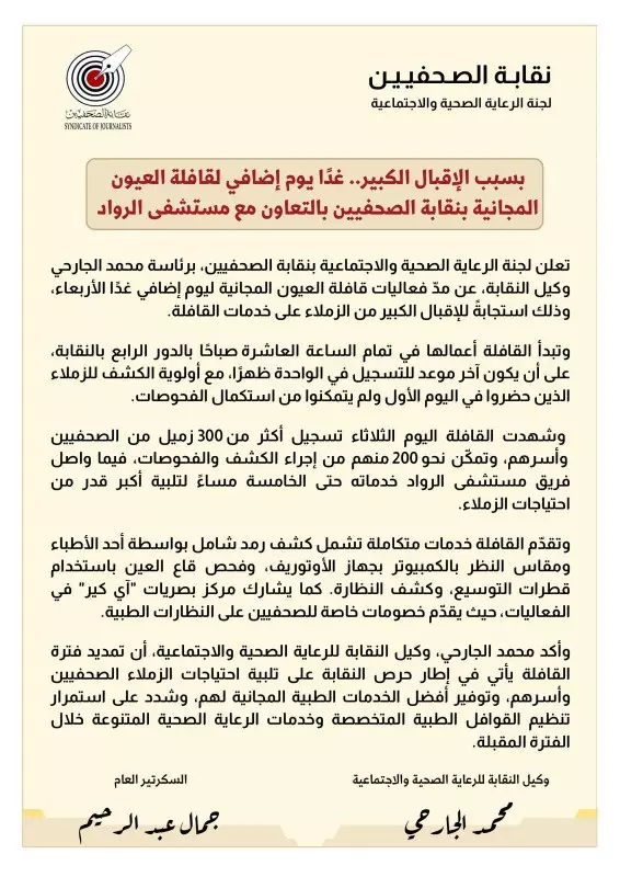 تعلن لجنة الرعاية الصحية والاجتماعية بنقابة الصحفيين، برئاسة محمد الجارحي وكيل النقابة، عن مدّ فعاليات قافلة العيون المجانية ليوم إضافي غدًا الأربعاء، وذلك استجابةً للإقبال الكبير من الزملاء على خدمات القافلة.
