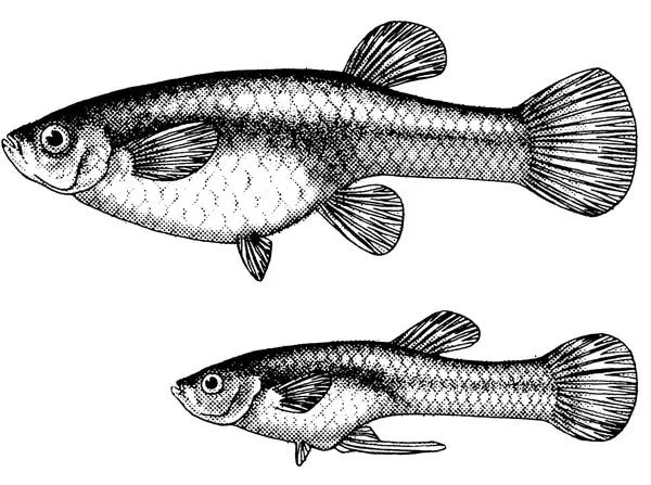 الخصائص الشكلية: صغيرة الحجم (4 سم للذكر و7 سم للأنثى)، ذات لون رمادي باهت، زعنفة ذيلية مستديرة، وفم أمامي متجه لأعلى.