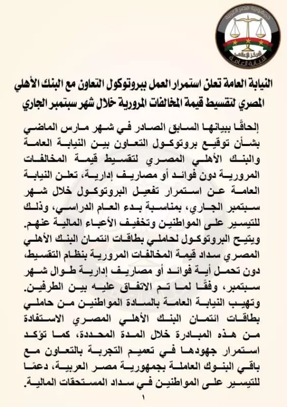 أعلنت النيابة العامة اليوم استمرار العمل ببروتوكول التعاون المُبرم مع البنك الأهلي المصري، والذي يتيح تقسيط قيمة المخالفات المرورية دون فوائد أو مصاريف إدارية، وذلك طوال شهر سبتمبر الجاري، تزامنًا مع بدء العام الدراسي الجديد، في إطار التيسير على المواطنين وتخفيف الأعباء المالية.