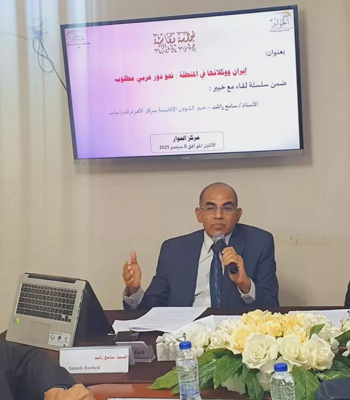 نظم مركز الحوار للدراسات السياسية والإعلامية جلسة نقاشية ضمن سلسلة “لقاء مع خبير” تحت عنوان: “إيران ووكلاؤها في المنطقة: نحو دور عربي مطلوب”، حاضر فيها الأستاذ سامح راشد، خبير الشؤون الإقليمية بمركز الأهرام للدراسات السياسية والاستراتيجية.