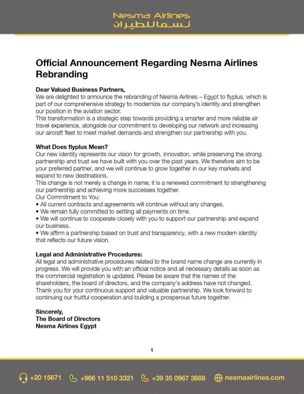 واختتمت الشركة بيانها بالتأكيد على تطلعها إلى بناء مستقبل واعد مع عملائها وشركائها، من خلال تعزيز الشراكات وتقديم خدمات جوية متطورة تحت الهوية الجديدة Flyplus.