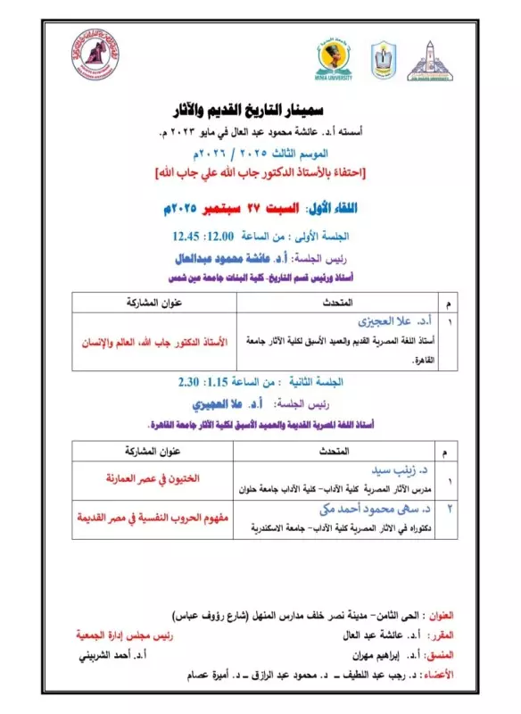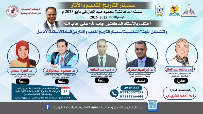 شهدت الجمعية المصرية للدراسات التاريخية بالقاهرة انطلاقة مميزة للموسم الثالث (2025 / 2026) من فعاليات السمينار العلمي لفرع التاريخ القديم والآثار، والذي يعقد هذا العام احتفاءً بالأستاذ الدكتور جاب الله علي جاب الله، أحد أعلام الدراسات المصرية القديمة.