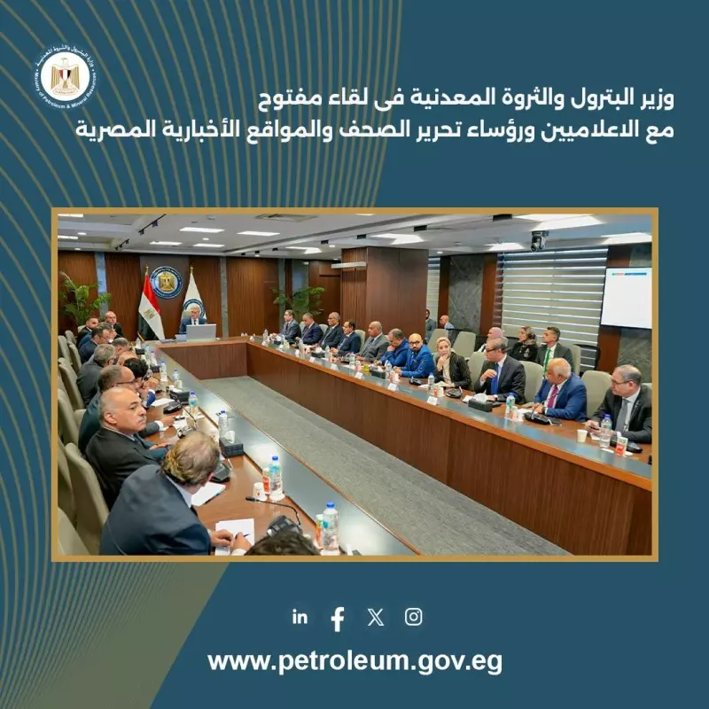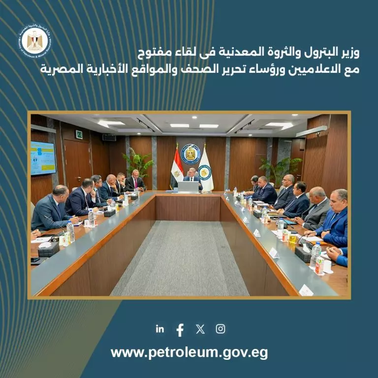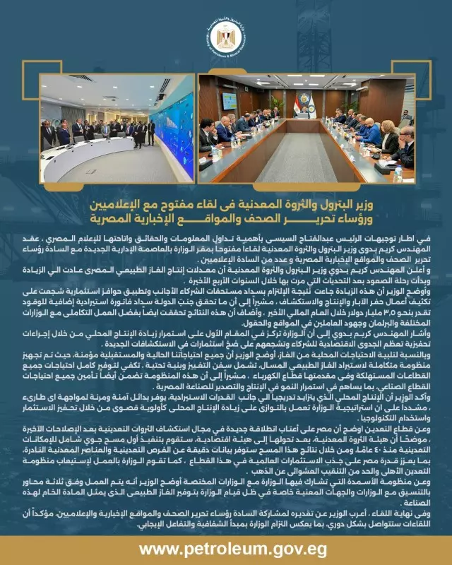 في اطار توجيهات الرئيس عبدالفتاح السيسى بأهمية تداول المعلومات والحقائق واتاحتها للإعلام المصري ، عقد المهندس كريم بدوى وزير البترول والثروة المعدنية لقاءاً مفتوحاً بمقر الوزارة بالعاصمة الإدارية الجديدة مع السادة رؤساء تحرير الصحف والمواقع الإخبارية المصرية وعدد من السادة الإعلاميين .