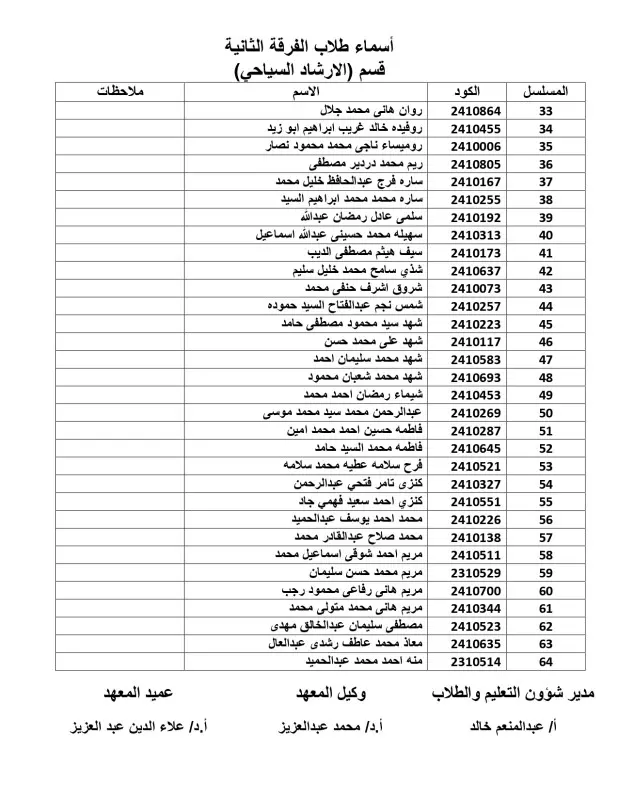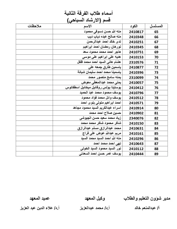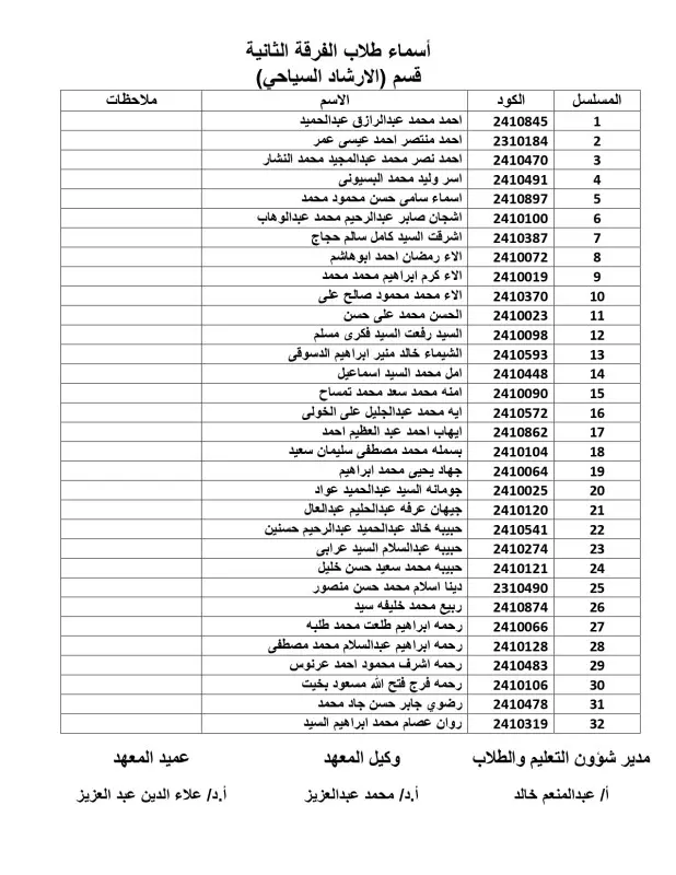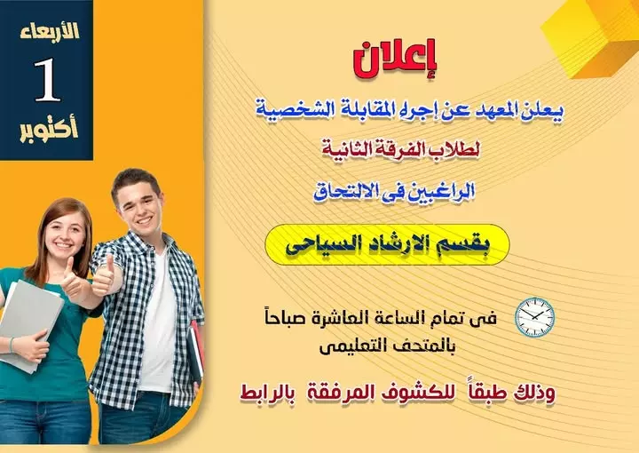 وكان المعهد  قد أعلن قائمة بأسماء الطلبة الراغبين فى الإلتحاق فى قسم الإرشاد السياحى  وحددالأول من أكتوبر لعقد المقابلات مع اللجنة المشكلة .