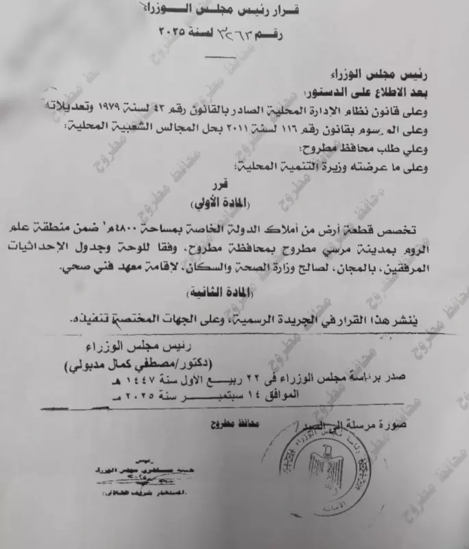 أعلن اللواء خالد شعيب محافظ مطروح ، عن صدور قرار الدكتور مصطفى مدبولي رئيس مجلس الوزراء، بالموافقة على تخصيص مساحة 4800 متر مربع لصالح وزارة الصحة لإقامة معهد فنى صحى بمنطقة علم الروم بمدينة مرسى مطروح .