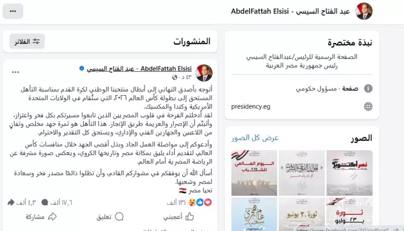 هنأ الرئيس عبدالفتاح السيسي المنتخب الوطني لكرة القدم بمناسبة تأهله رسميًا إلى بطولة كأس العالم 2026، التي ستُقام في الولايات المتحدة الأمريكية وكندا والمكسيك.