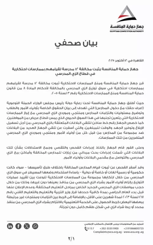 أعلن جهاز حماية المنافسة ومنع الممارسات الاحتكارية ثبوت مخالفة 12 مدرسة لقيامهم بممارسات احتكارية في سوق توزيع الزي المدرسي بالمخالفة لأحكام المادة 8 من قانون حماية المنافسة ومنع الممارسات الاحتكارية رقم 3 لسنة 2005.
