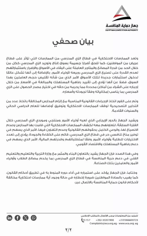 وفي هذا الصدد فإن الجهاز يشيد بالتعاون البناء والمثمر مع وزارة التربية والتعليم والتعليم الفني في دعم حرية المنافسة في قطاع الزي المدرسي بما يخدم مصالح الطلاب وأولياء الأمور والعاملين بتلك الصناعة.
