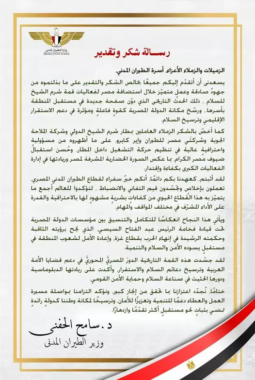وجّه الدكتور الطيار سامح الحفني، وزير الطيران المدني، رسالة شكر وتقدير إلى جميع العاملين في قطاع الطيران المدني المصري، تقديراً لجهودهم المتميزة وعطائهم المتواصل خلال فترة استضافة مصر فعاليات قمة شرم الشيخ للسلام، التي شهدت مشاركة واسعة من قادة وزعماء العالم، واعتُبرت حدثاً تاريخياً يؤكد مكانة الدولة المصرية وقدرتها على التنظيم والإدارة باحترافية عالية.