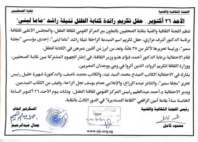 ويدير الاحتفالية د.أحمد عبدالعليم رئيس المركز القومي لثقافة الطفل، وذلك يوم الأحد 26 أكتوبر الساعة الخامسة مساءً بقاعة أمين الرافعي “القاعة المستديرة” في الدور الثالث بالنقابة.