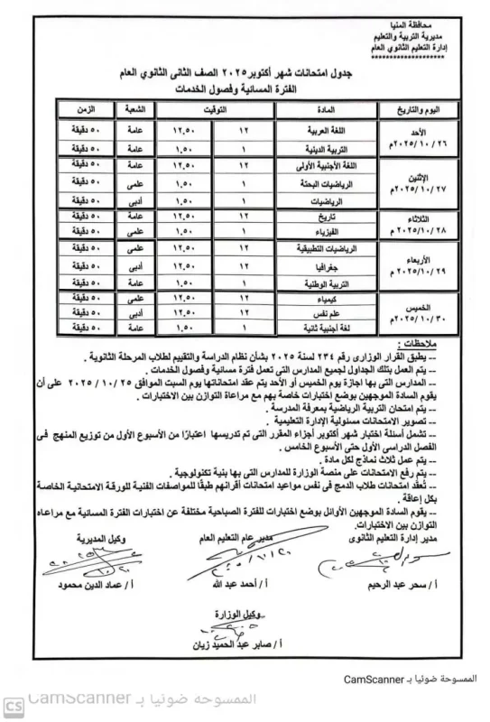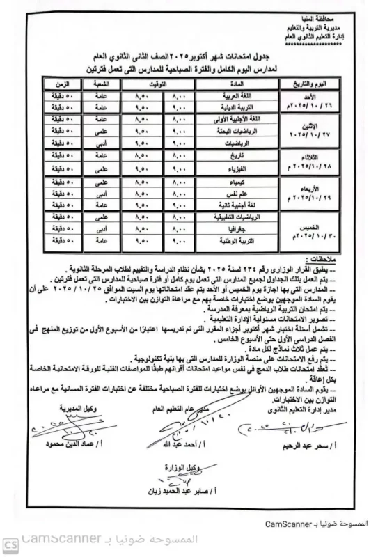 وأعلنت المديرية جدول امتحانات شهر أكتوبر الصف الثاني الثانوي 2025 المنيا والذي جاء كالآتي: